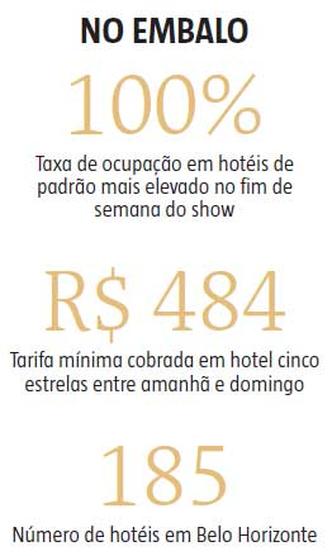 A rede hoteleira de Belo Horizonte comemora a vinda do ex-beatle Paul McCartney para a capital. Nas redondezas do Mineir�o, as reservas dos quartos de hot�is e pousadas para amanh� est�o esgotadas h� mais de um m�s. Em hot�is de padr�o mais elevado, como Othon e Mercure Lourdes, a taxa de ocupa��o chegou a 100% no fim de semana do show ou restam apenas algumas vagas em quartos com tarifas mais elevadas. Em grande parte dos hot�is, o valor das tarifas � reajustado de acordo com a taxa de ocupa��o, assim como ocorre com os bilhetes a�reos. Em alguns casos, o pre�o da tarifa atual est� o dobro do valor da mais econ�mica.