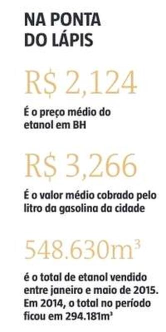 O valor suficiente para encher o tanque de um carro com etanol em Belo Horizonte permite ao motorista rodar por 480 quil�metros. Com o mesmo valor, caso opte por usar gasolina, o condutor ir� rodar quase 100 quil�metros a menos. Os seguidos reajustes aplicados ao combust�vel derivado do petr�leo, associados � redu��o da al�quota do ICMS do �lcool, tornou o produto mais vantajoso. Levantamento de pre�os feito pelo site Mercado Mineiro mostra que o litro do etanol corresponde, em m�dia, a 65,03% do pre�o da gasolina nas revendas da capital mineira.