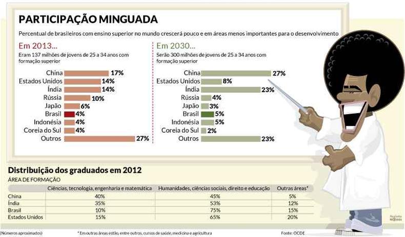 No Brasil, a participa��o vai passar de 4% para 5%, o que representa quase o triplo do n�mero de jovens formados (de 5,48 milh�es vai para 15 milh�es). Mas, diferentemente dos pa�ses que mais crescem nesse sentido – China e �ndia, que, sozinhos, responder�o pela metade dos jovens formados em 2030 –, o processo no Brasil � desequilibrado. Segundo a OCDE, 75% dos diplomas emitidos no pa�s ainda s�o da �rea de humanas, enquanto apenas 10% s�o de cursos de exatas. Ou seja, o pa�s n�o tem priorizado forma��es relacionadas a tecnologias, como engenharia, que, em um contexto de globaliza��o, s�o cada vez mais importantes.