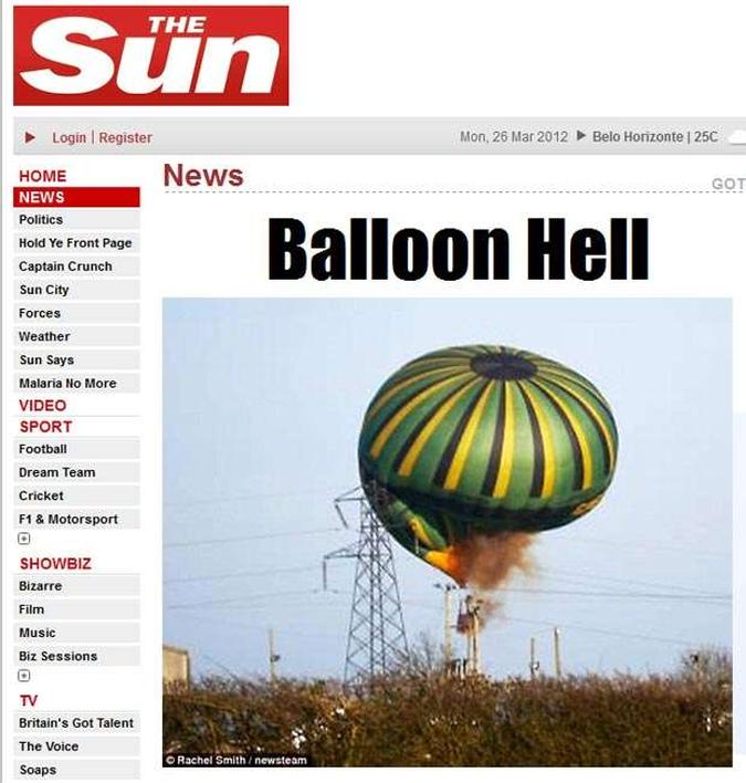 Tr�s pessoas foram resgatadas com ferimentos leves depois que o bal�o de ar quente em que voavam ficou preso em fios de alta tens�o. O piloto tinha 19 anos e era filho de um outro piloto, que viu quando o bal�o se enroscou nos fios de alta tens�o.