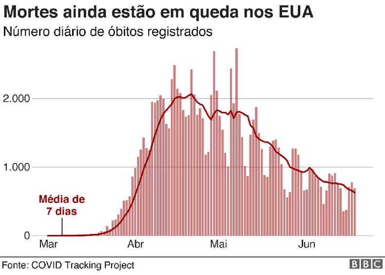 Em meio aos temores sobre novos focos de casos, a not�cia mais positiva at� agora nos Estados Unidos � a queda do n�mero di�rio de mortes.