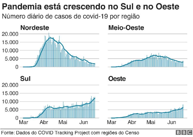 O Sul e o Oeste do pa�s, por outro lado, t�m enfrentado um grande aumento do n�mero de infec��es, segundo dados compilados pela plataforma online COVID Tracking Project.