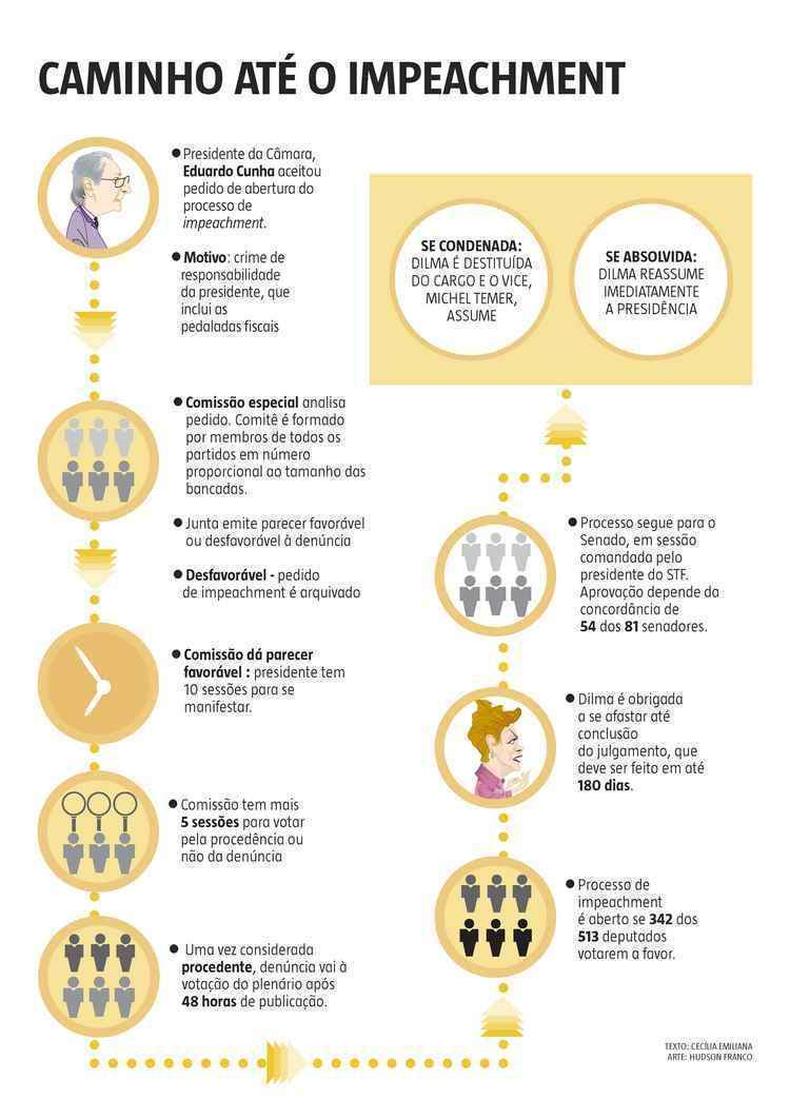 De acordo com o Regimento Interno da C�mara, a comiss�o especial deve ter entre 17 e 66 integrantes eleitos, em plen�rio, por maioria simples. Ap�s 48 horas da escolha dos membros da comiss�o, ser�o sorteados o presidente e o relator. A partir da�, a presidente Dilma ter� dez sess�es para apresentar sua defesa. Com a defesa apresentada, o colegiado tem at� cinco sess�es para proferir o parecer pela proced�ncia ou n�o do processo.