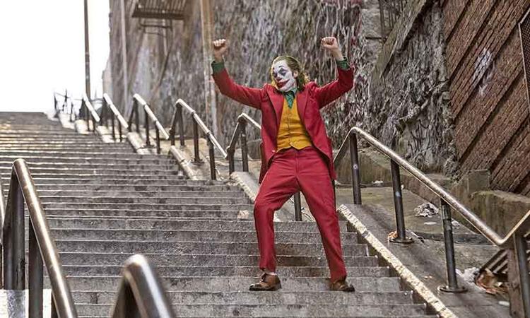 Cena do filme Coringa, estrelado por Joaquin Phoenix: no lado iluminado do personagem, o palha�o Happy busca fama, uma cr�tica � espetaculariza��o da vida privada