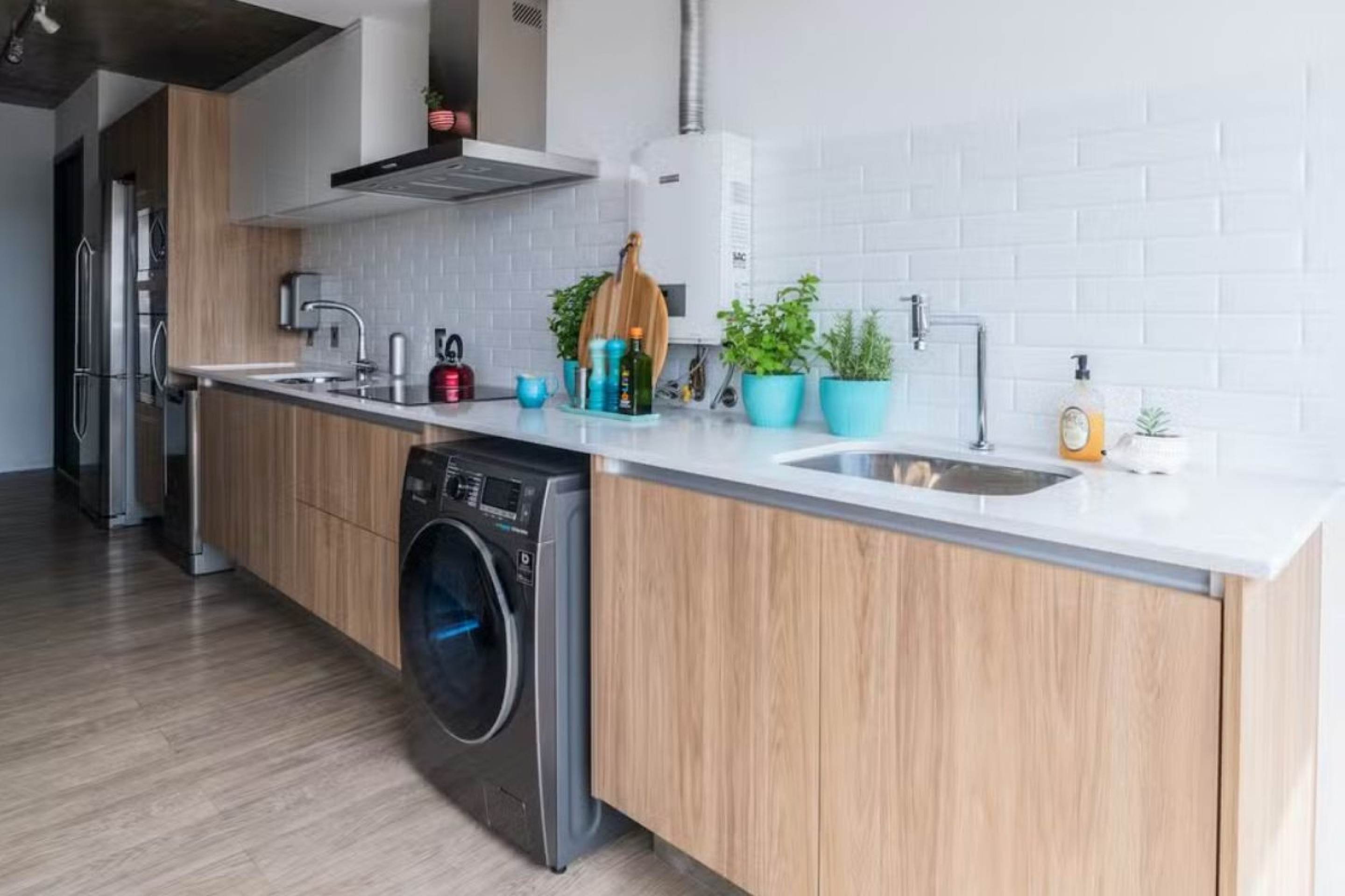 Uma das soluções mais práticas é esconder o aquecedor em um armário planejado. Certifique-se de que o móvel tenha aberturas para ventilação e seja feito de material resistente ao calor, como: aço inoxidável, madeira tratada ou MDF e vidro temperado.