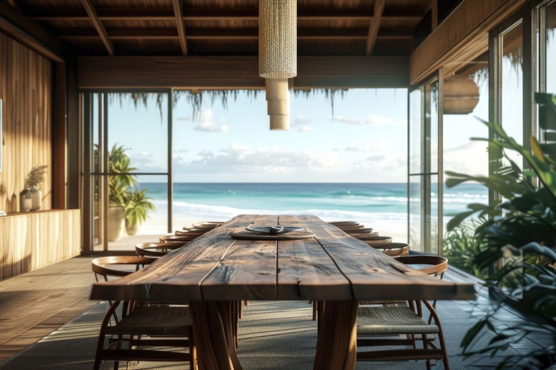 Um dos elementos mais marcantes da casa de praia é a iluminação natural durante o dia e o clima suave ao entardecer. Para reproduzir essa sensação: