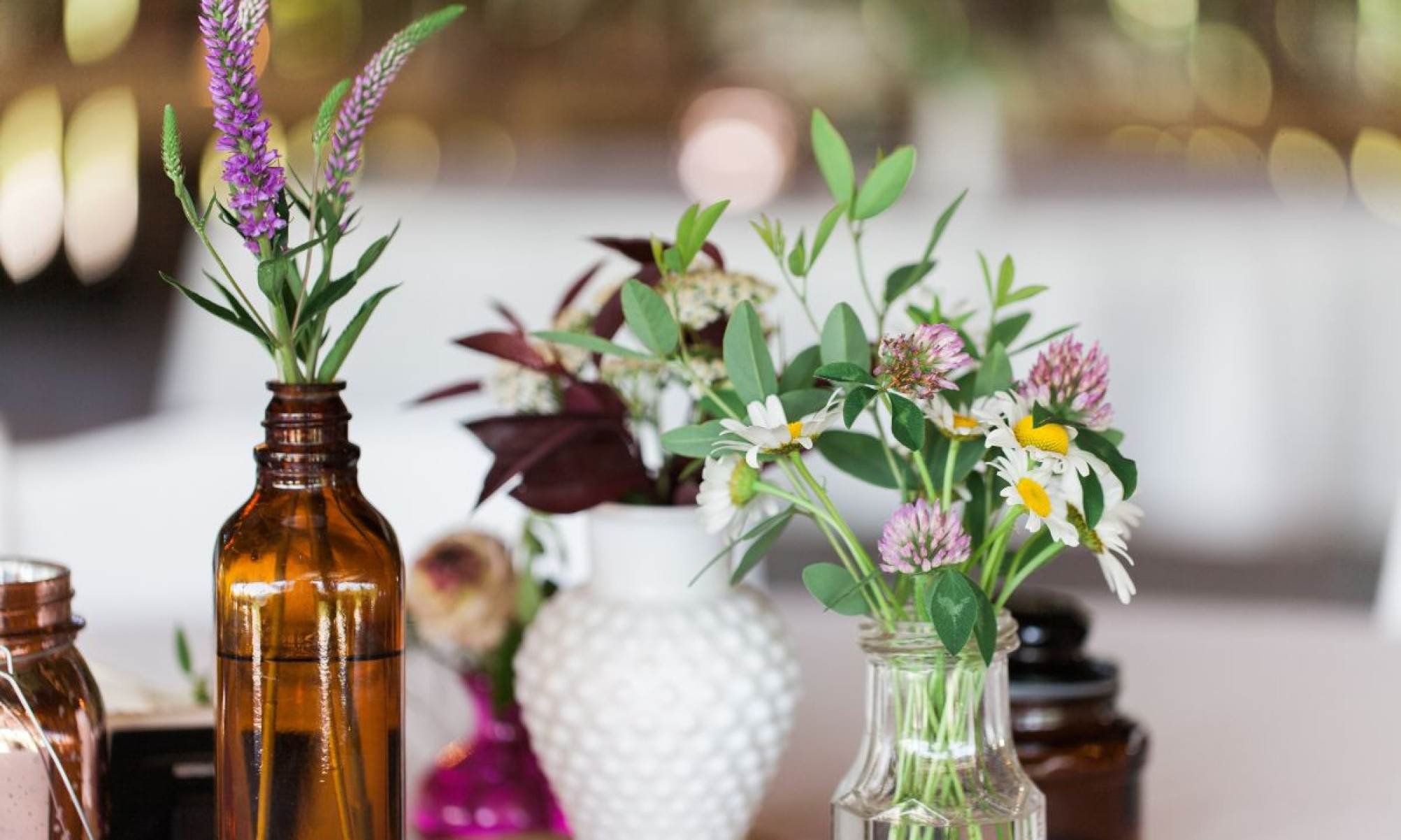 Usar garrafas como vasos é um dos usos mais simples e bonitos. As de vidro transparente ou verde ficam ótimas com flores do campo ou folhagens tropicais. Dá para criar um arranjo sóbrio ou apostar em uma composição mais colorida com várias garrafas lado a lado, em diferentes alturas e formatos.
