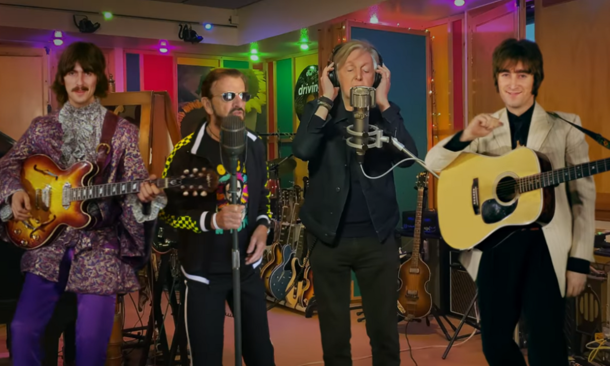 George Harrison também é colocado no estúdio de gravação ao lado dos companheiros de banda. O clipe ainda recupera imagens de arquivo e de shows do grupo e brinca com passado e presente ao colocar o jovem Paul McCartney dividindo os vocais com o sir Paul de 2023. Enquanto isso, Ringo Starr com seu uniforme colorido de ‘Sgt. Pepper's Lonely Hearts Club Band' toca bateria junto com o Ringo dos dias de hoje.
