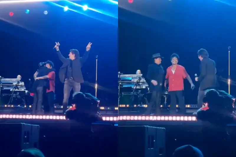 O último show de Bruno Mars, o Bruninho, no estádio Morumbis, na noite deste domingo (13), teve direito a uma surpresa: Chitãozinho e Xororó cantando "Evidências", um grande sucesso do repertório da dupla.