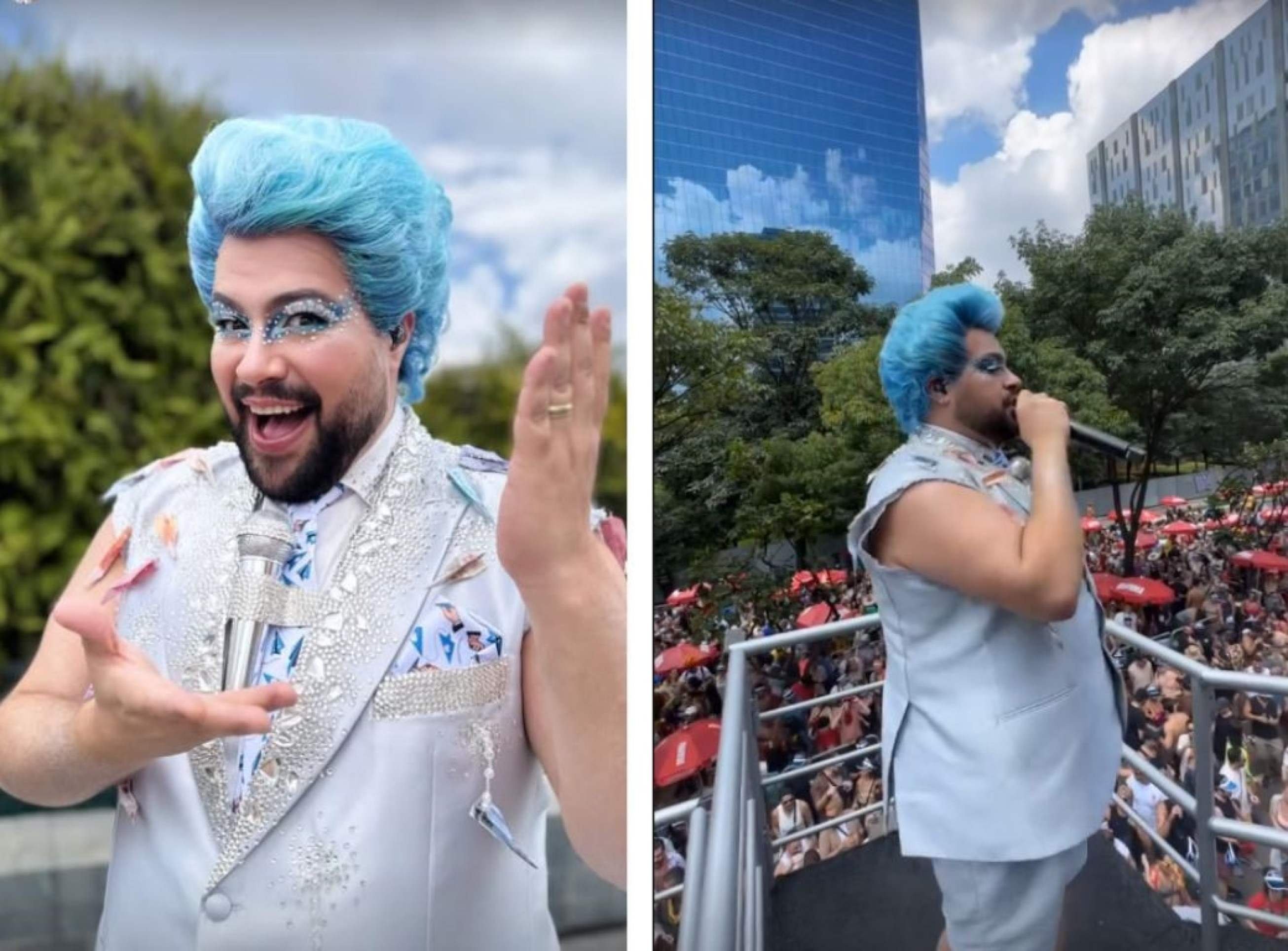 A música "Silvio Santos vem aí" abriu o bloco de carnaval comandado pelo apresentador Tiago Abravanel neste sábado (22/2) na avenida Faria Lima, em São Paulo. Com peruca azul, paletó cinza brilhante e microfone grudado ao peito, o cantor homenageia o avô Silvio Santos. O apresentador morreu em agosto de 2024, em decorrência de uma brocopneumonia, aos 93 anos.