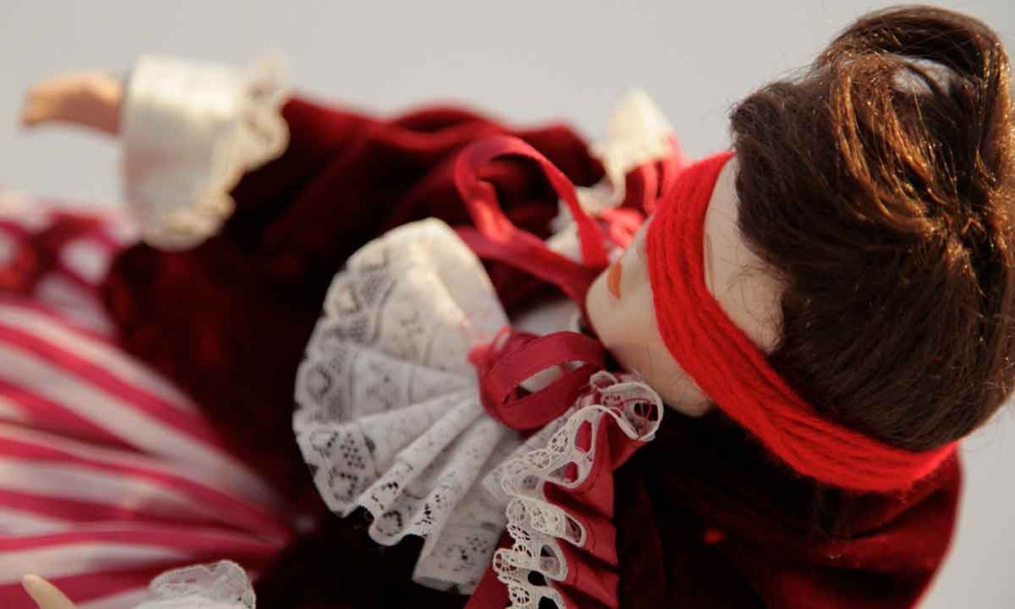 Outra escultura, “Mamãe, o encontro”, traz uma boneca com um vestido vermelho, que, pendurada, observa um espelho quebrado no chão, em um cenário dramático onde as cores vermelho, preto e branco evocam um universo de tensão, reflexão e perda.