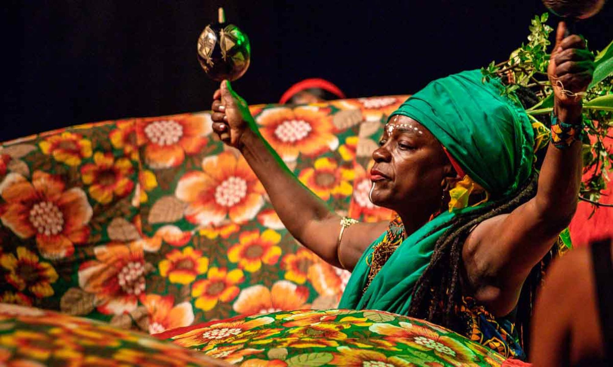 “Represento uma cabocla que tem na cabeça, em vez de um penacho, uma espécie de cocar de folhas, para trazer um pouco essa coisa da ligação da cultura indígena com a cultura negra. Faço a 'dança guerreira', incluindo elementos do congo e do maculelê, e me utilizo do poema 'Vozes mulheres', de Conceição Evaristo”, conta.