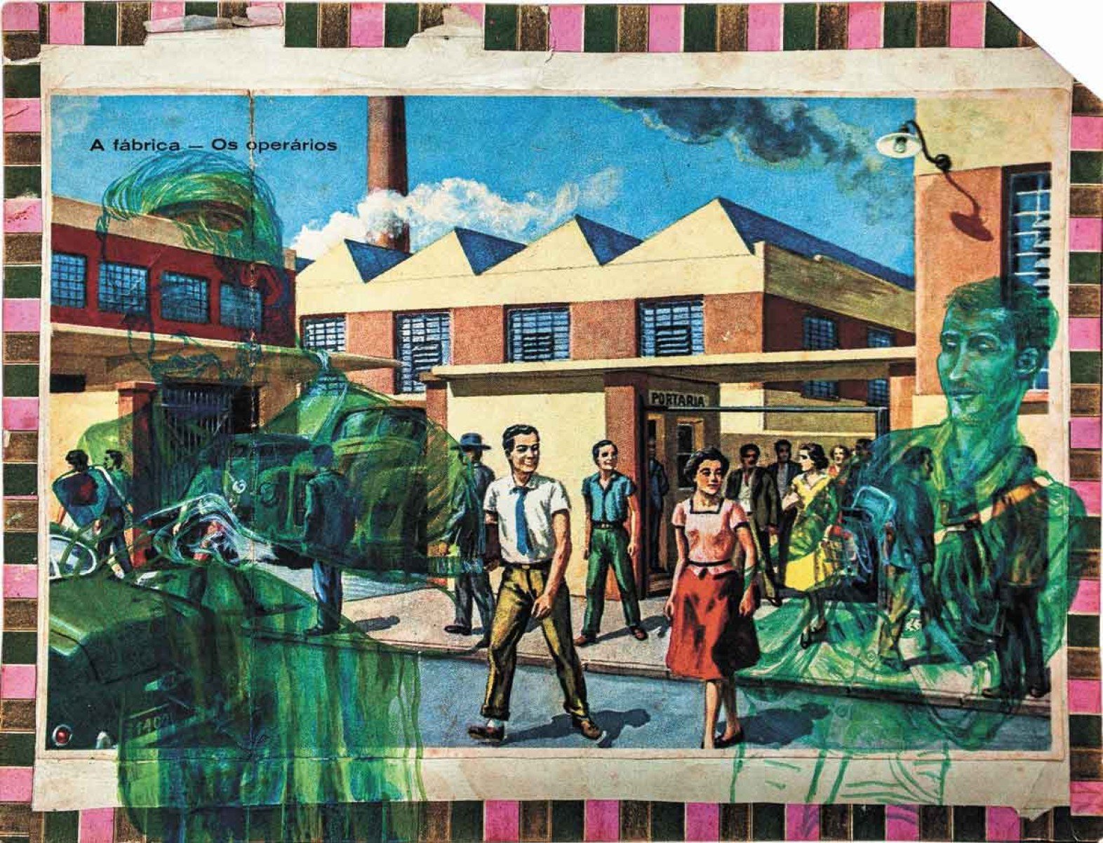 Ele conta que a primeira obra da série que dá nome à exposição teve como inspiração cartilhas de escola que ganhou de uma tia, dona de um brechó, que sabia de seu apreço por imagens antigas. “Essas cartilhas mostravam, por exemplo, trabalhadores saindo da fábrica. Tem uma com um telégrafo desenhado. Em outra, tem uma mulher ouvindo uma vitrola. São todas ilustrações das décadas de 1950 e 1960. Sobrepus essa imagem das pessoas saindo do trabalho com o desenho de um sujeito olhando o celular.”