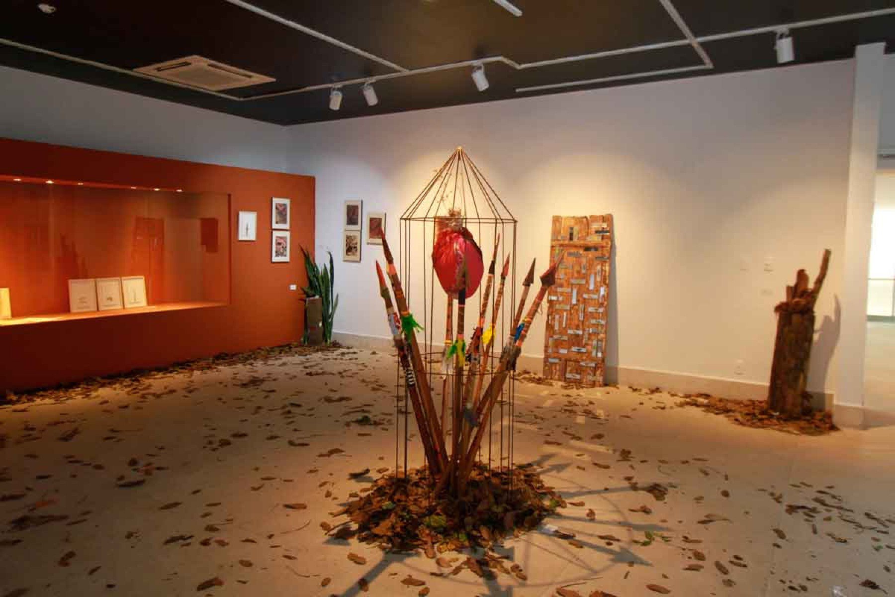 No ponto central da exposição, o visitante se depara com uma gaiola do tamanho de uma pessoa, cercada por lanças indígenas, confinando um coração gigante. “A primeira associação que se faz é com algum conflito armado, porque a lança é vista como arma, né? Mas, no contexto da mostra, ela representa um ritual. É como se aquele coração estivesse envolvendo aquelas lanças”, explica Orange.
