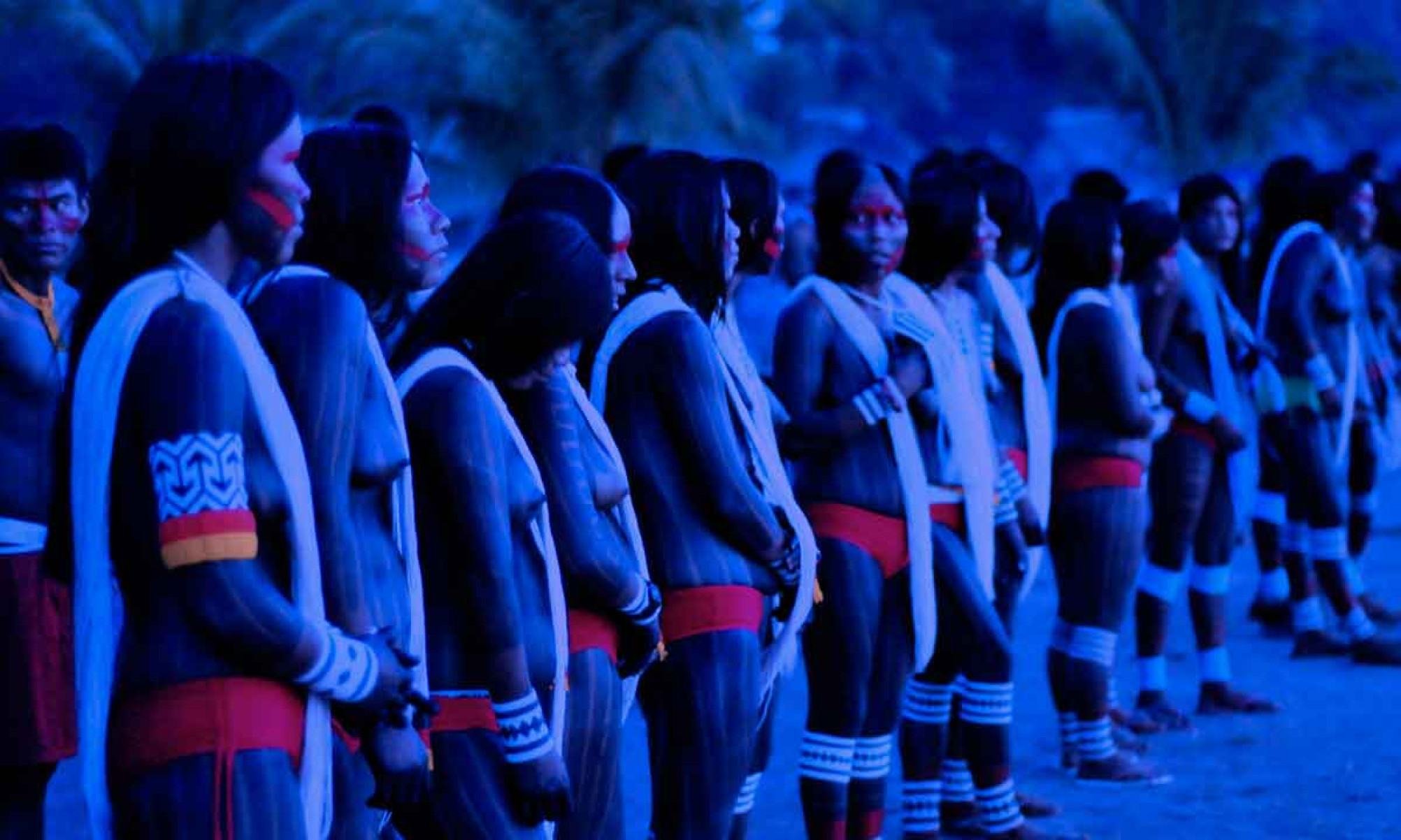 Em um dos quadros, mulheres indígenas estão alinhadas com o peito nu e o rosto pintado de vermelho. Cordas brancas a tiracolo atravessam os corpos, enquanto pulseiras adornam braços. Elas participam de uma espécie de ritual, e o azul que domina a fotografia remete ao mistério e ao sagrado.