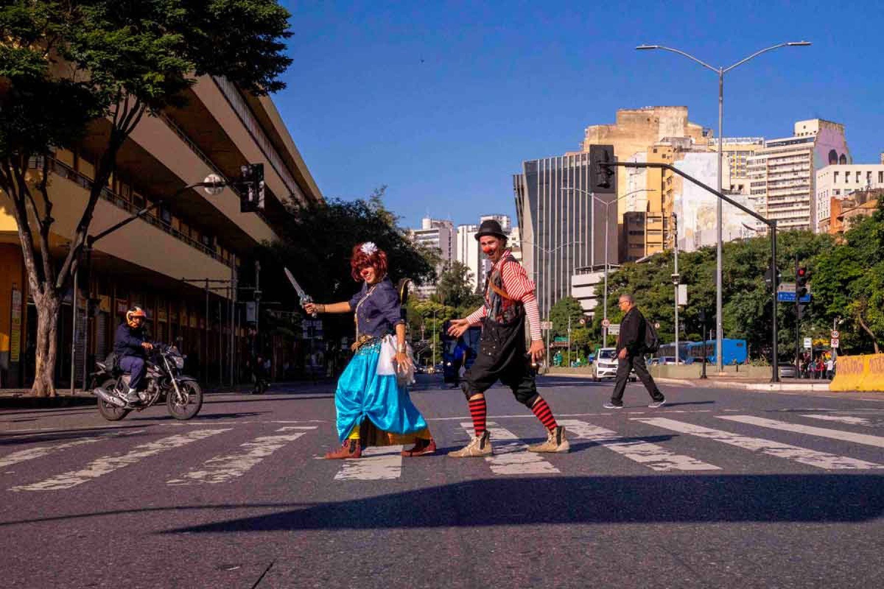 O trajeto realizado em cena permite aos atores trabalhar a ocupação do espaço público. Sob a direção de Marina Viana, os dois transformam praças e centros culturais em palcos para dança, acrobacia, música e interação com os espectadores.