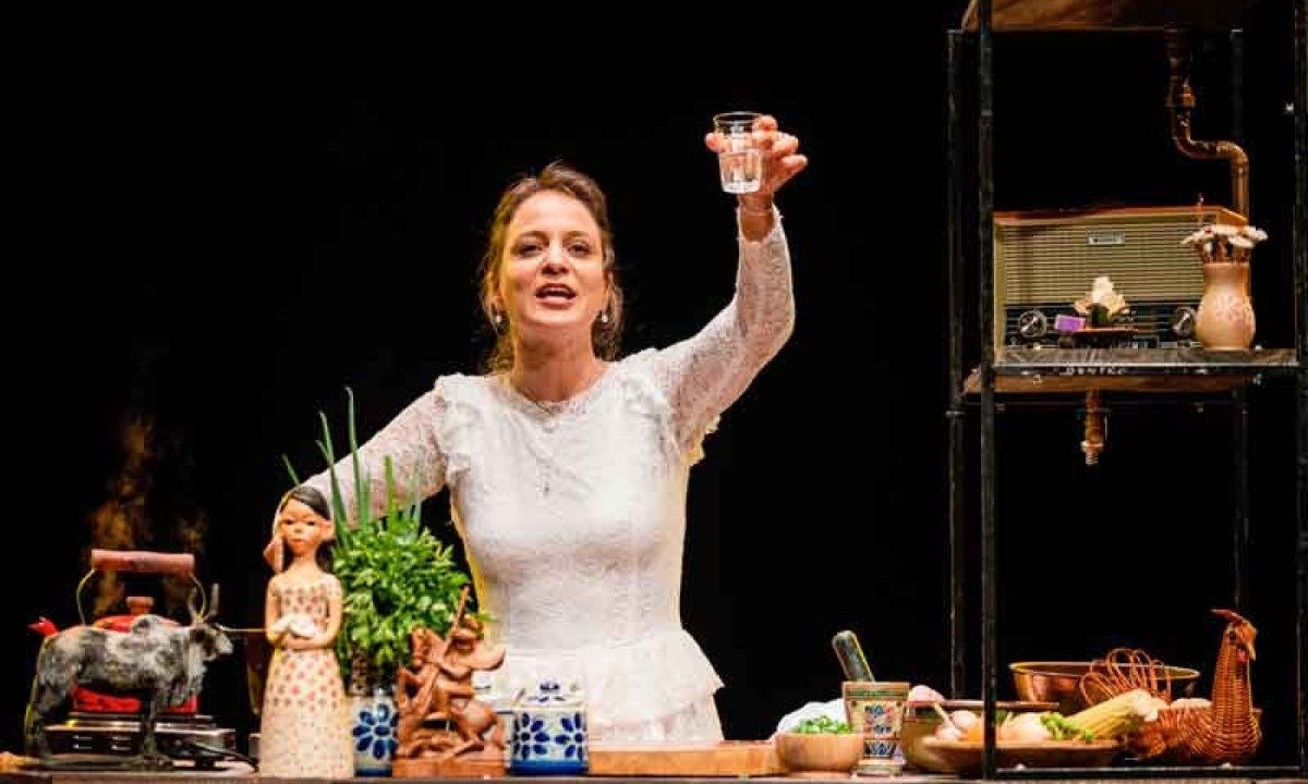 Atriz cozinha ao vivo em ‘Enluarada’ e serve galinhada no fim da peça