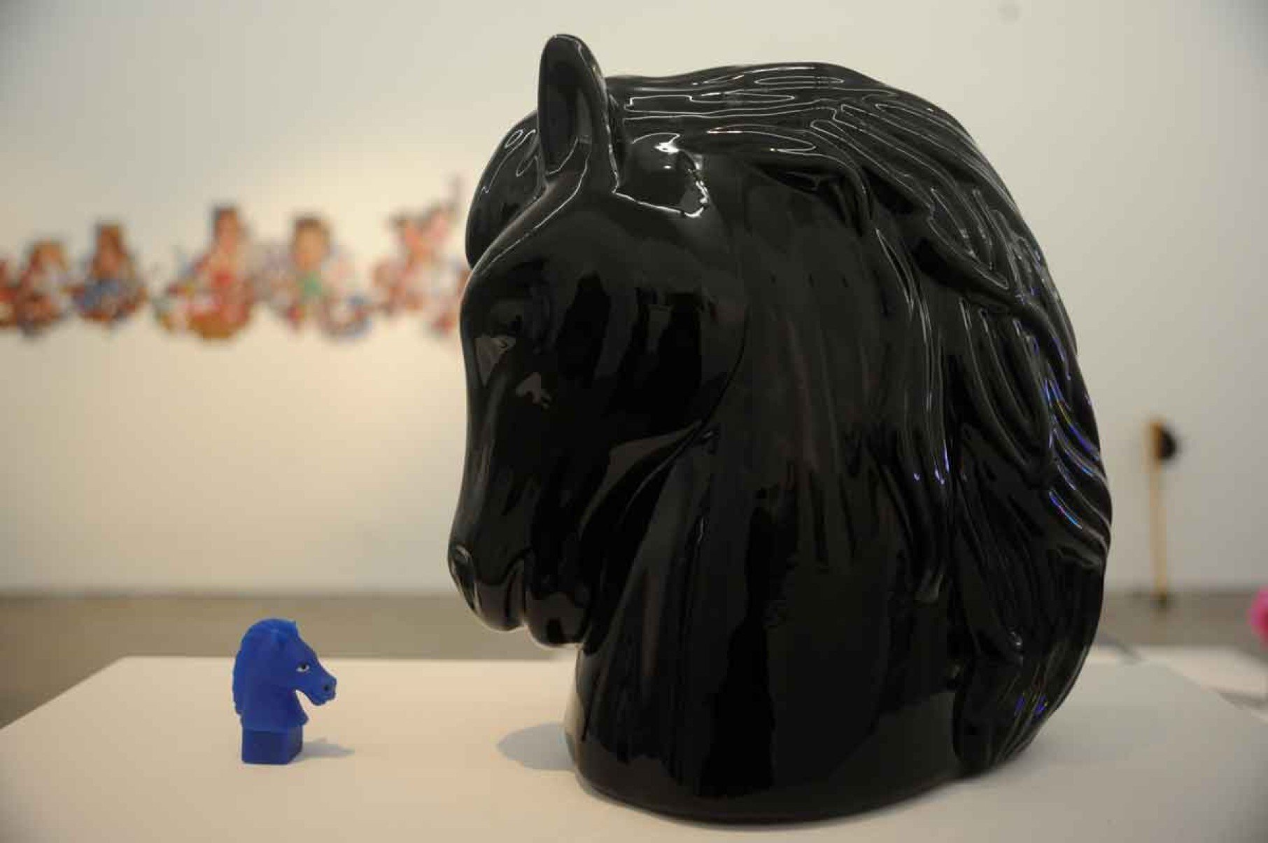 Duas réplicas de cabeças de cavalo estão dispostas frente a frente. Só esse arranjo já basta para evocar tensão, confronto e espelhamento. No entanto, a desigualdade entre os dois objetos potencializa tais aspectos: uma cabeça é de louça, maior, mais frágil e refinada; enquanto a outra é de borracha, menor, lúdica, porém resistente.