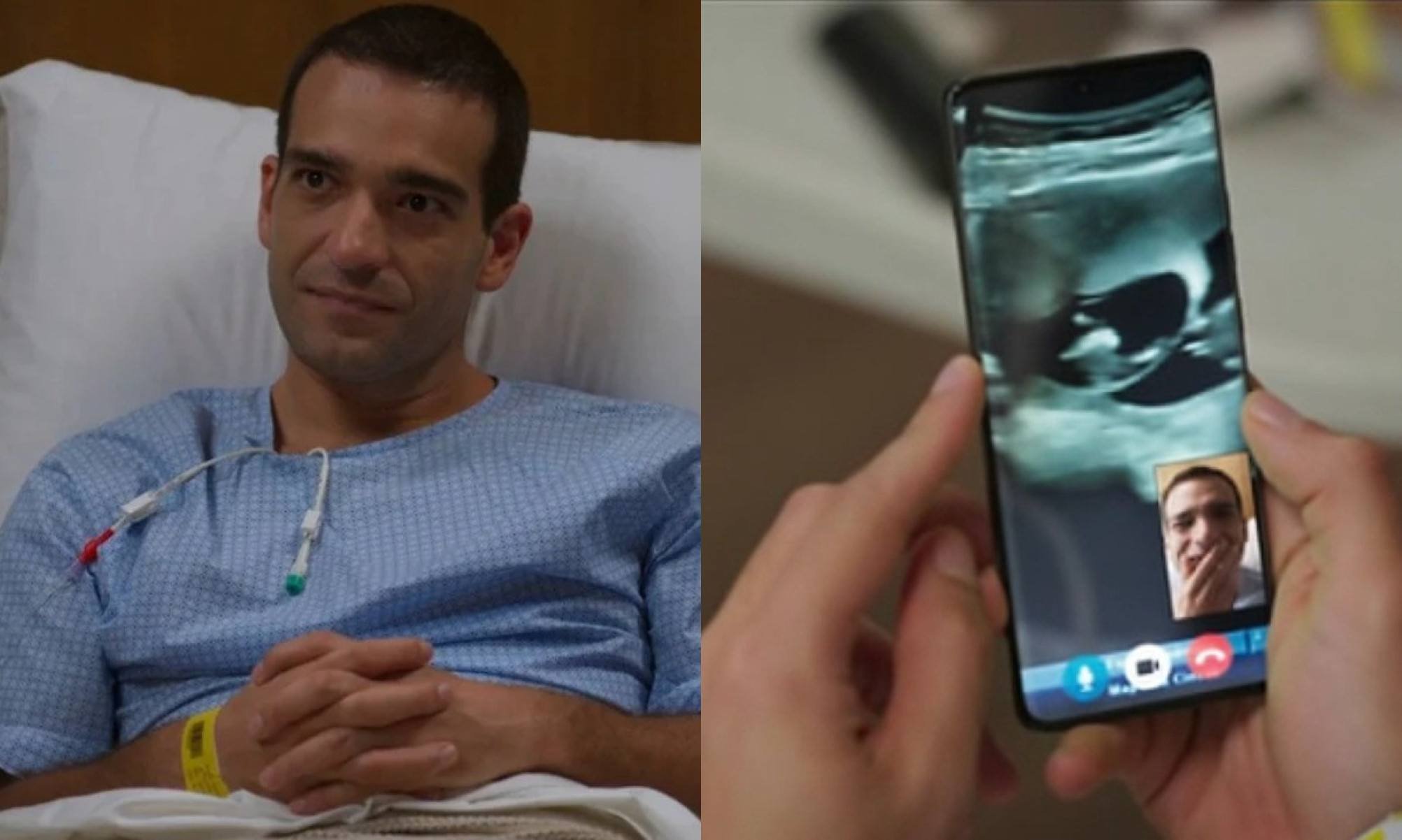 Na cena, Afonso acompanhava o ultrassom de Solange (Alice Wegmann) por vídeo chamada. Enquanto ele segurava o celular com as duas mãos, aparecia na tela do mesmo celular com uma das mãos no rosto.