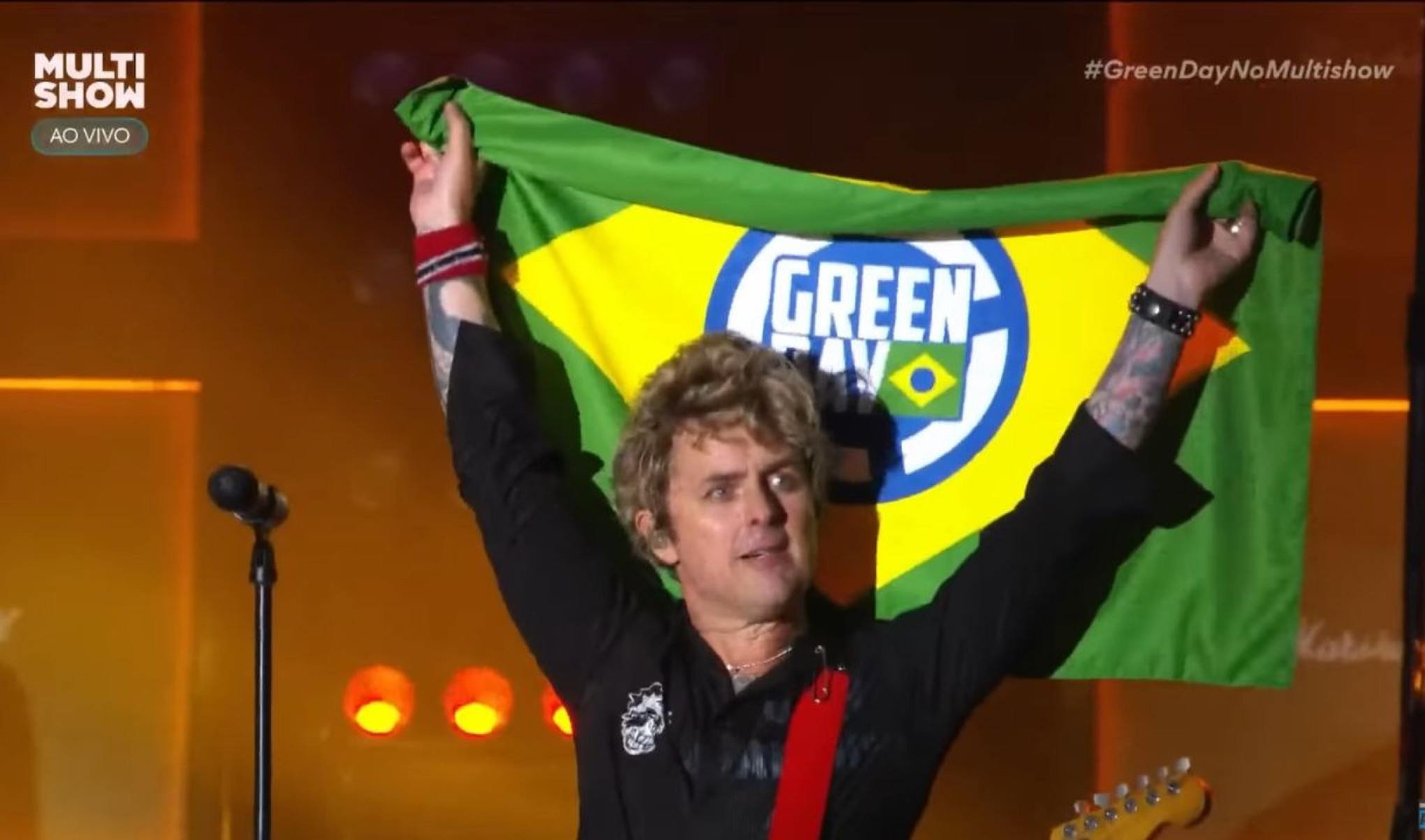 Billie Joe com bandeira do Brasil com ícone do Green Day - (crédito: Multishow / Reproduçãp)