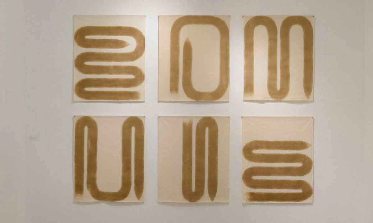 A primeira sala da exposição apresenta os trabalhos mais recentes do artista. São fios de papel torcido com nós e amarrações que criam formas que lembram plantas. O resultado, segundo ele, é uma espécie de “catalogação botânica”. No centro do espaço, estão três grandes folhas de palmeira que vão do teto ao piso.