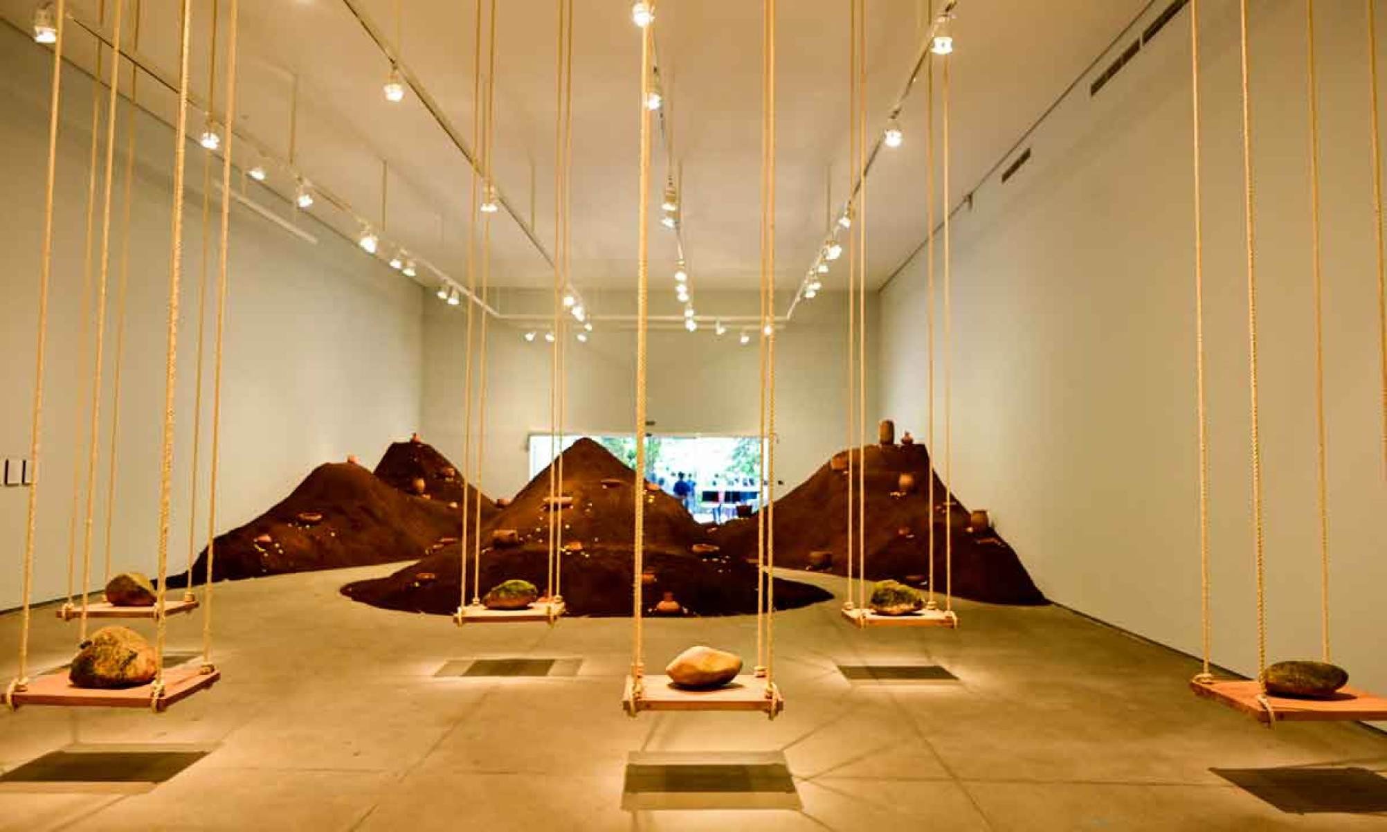 Em frente à entrada da Galeria Lago, o visitante se depara com a primeira obra, “Rajawal Rama (Dono do tempo)”, uma pedra de quatro toneladas, cuja forma lembra uma tartaruga, com um olho desenhado na parte que corresponde à cabeça do animal. No interior do prédio, o público é convidado a atravessar uma paisagem com obras feitas de folhas, pedras, madeira e terra, elementos naturais que narram histórias e testemunham cosmologias dos povos originários.