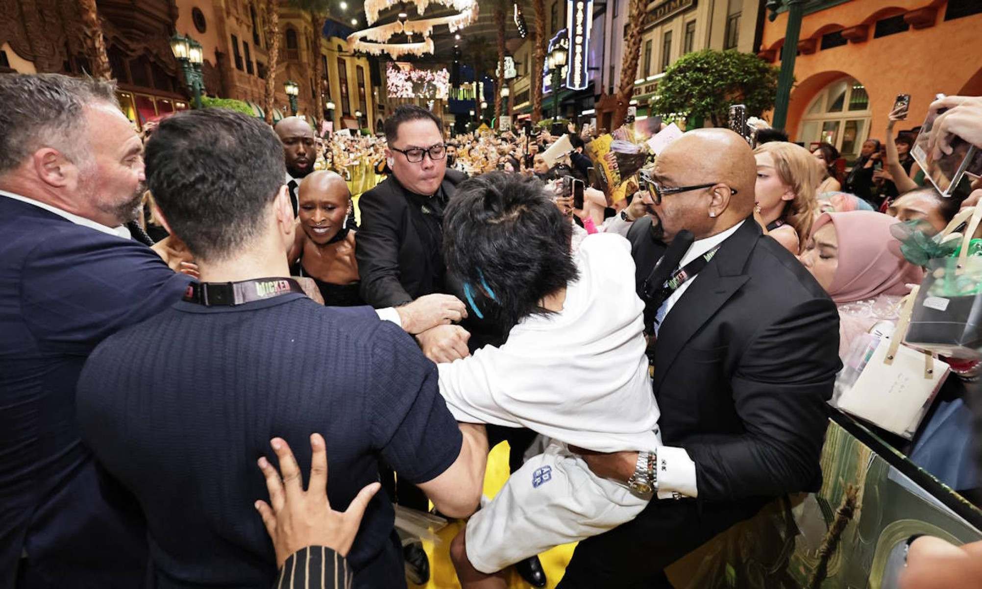 Vídeos que viralizaram mostram Wen, de 26 anos, envolvendo Ariana Grande - visivelmente surpresa - com o braço, enquanto sua colega de elenco, Cynthia Erivo (38 anos) corre para protegê-la.
