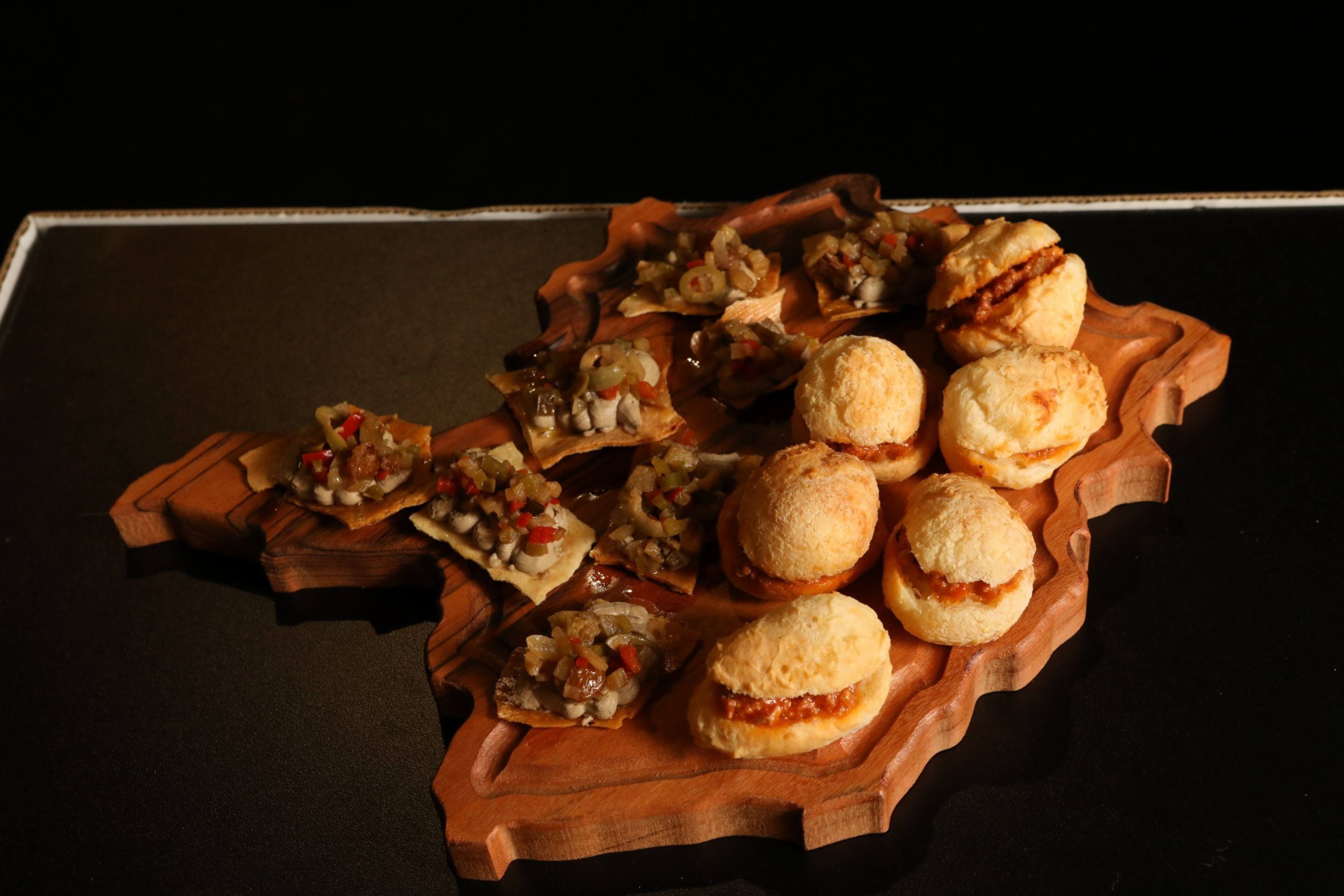 Telha de pão de queijo com mousse de fígado de galinha com panacota de juló foi item apresentado no jantar pela chef Yves Saliba