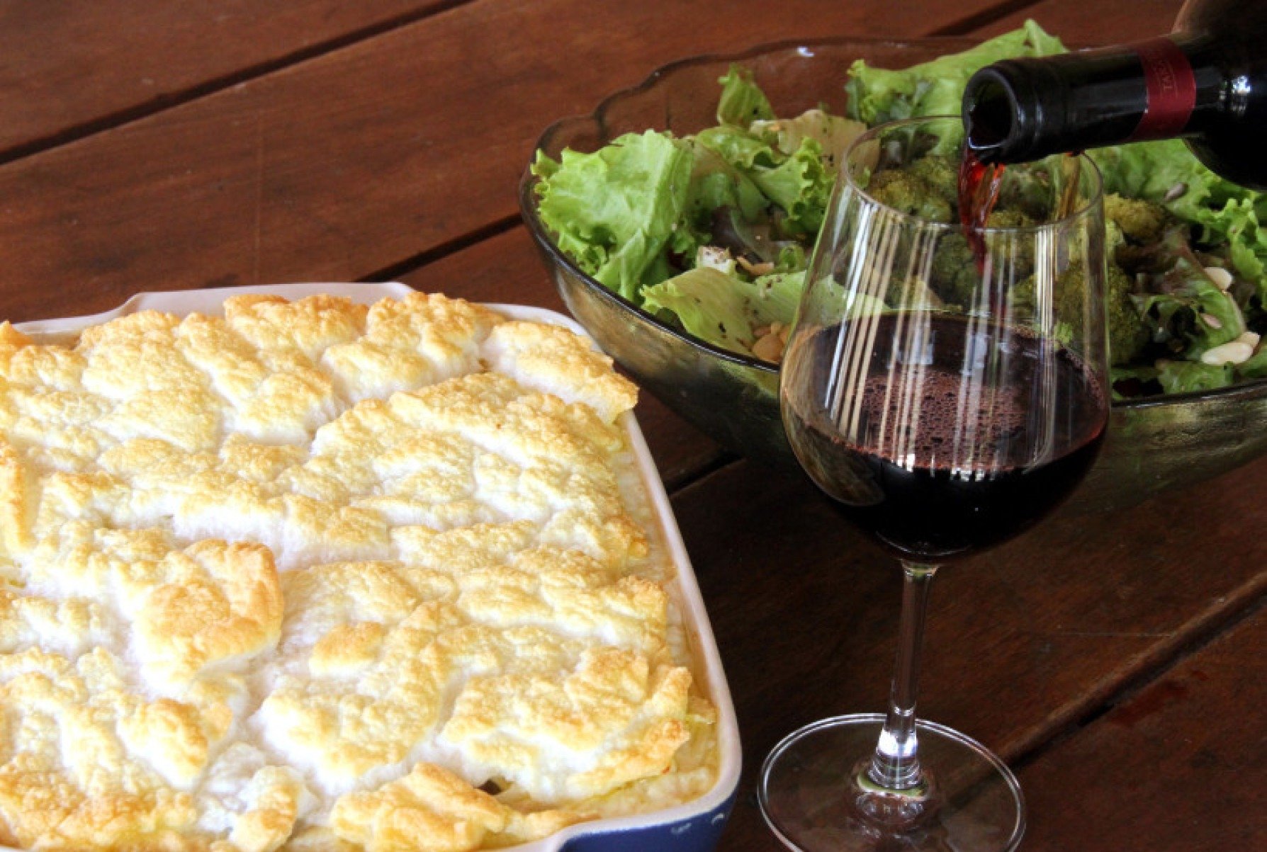 Desfiar o bacalhau grosseiramente. Regar um recipiente com azeite, colocar uma camada de batata, bacalhau, azeite, cebola em rodelas e molho branco. Repetir as camadas e colocar as claras e levar ao forno (180 graus) até dourar.