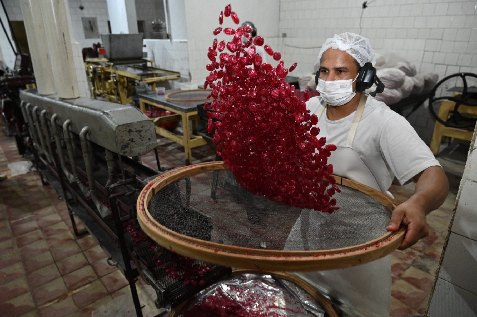 Esses pedaços passam por uma esteira e chegam em uma grande peneira, que, ao ser chacoalhada, filtra retalhos de bala que não passam pelo controle de qualidade. Quando estão já no formato previsto, as balas são dispostas em outra bancada de inox, onde precisam esfriar sem correr o risco de grudar umas nas outras, Por isso, elas não podem ser armazenadas em sacos logo após a produção.