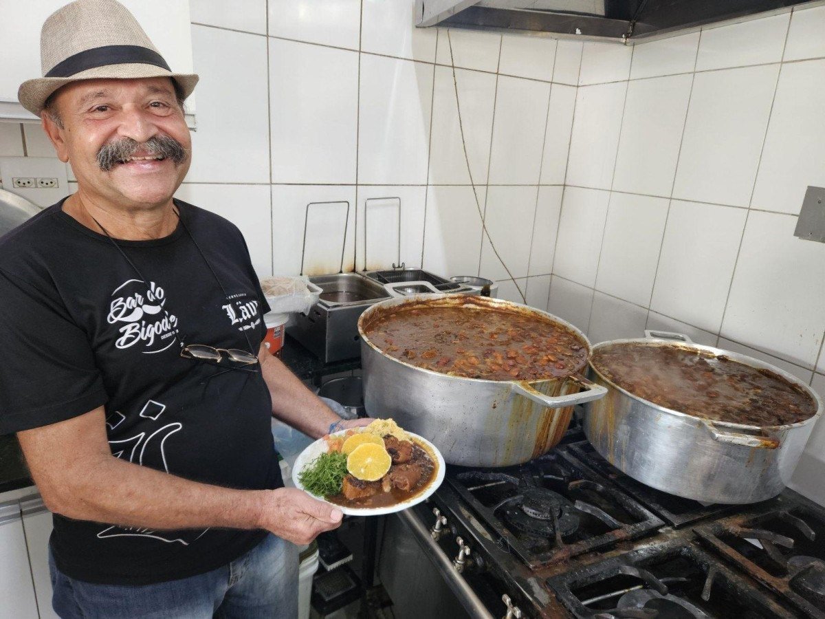 Apesar de assinar a história da receita, Bigode faz questão de destacar o talento de quem hoje comanda as panelas: a chef Maria Aparecida Ribeiro, ou simplesmente Cida, há 21 anos no bar e responsável por refinar o preparo que virou patrimônio afetivo da cidade.