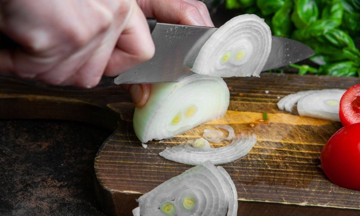 Corte sob água corrente: cortar a cebola debaixo da torneira ou manter a lâmina da faca constantemente molhada ajuda a absorver e dispersar o gás antes que ele volatilize;