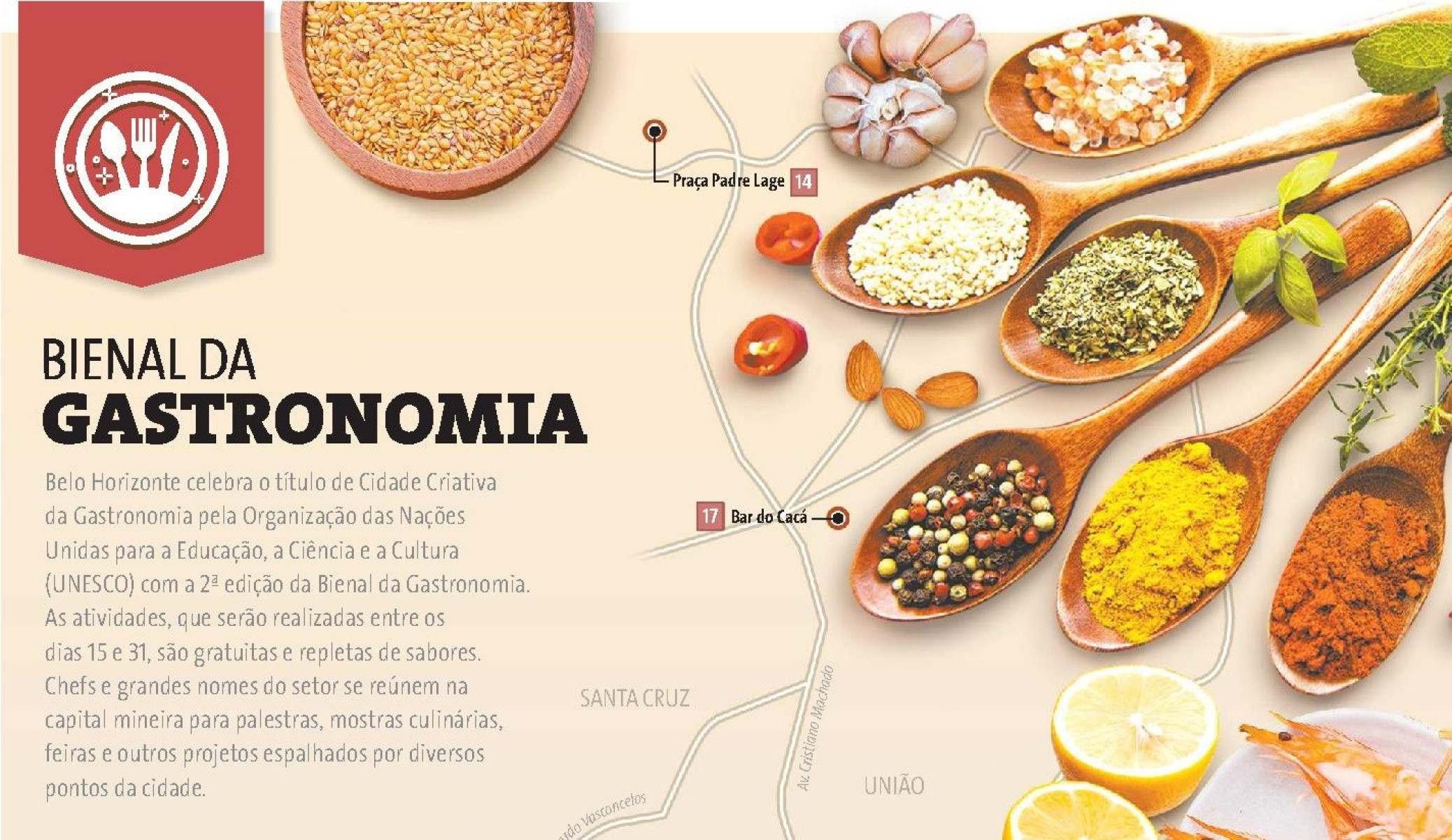 Belo Horizonte celebra o título de Cidade Criativa da Gastronomia pela Organização das Nações Unidas para a Educação, a Ciência e a Cultura (UNESCO) com a 2ª edição da Bienal da Gastronomia. As atividades, que serão realizadas entre os dias 15 e 31, são gratuitas e repletas de sabores.