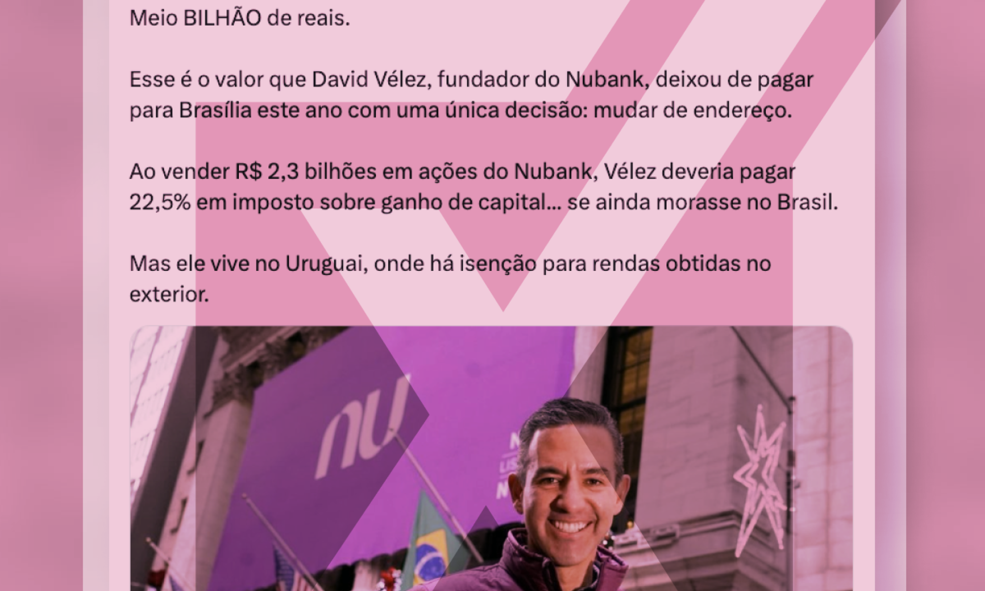 A venda de ações do Nubank por parte de David Vélez, um dos fundadores da empresa, tem gerado desinformação nas redes sociais. A maioria dos posts alega que o empresário teria economizado R$ 500 milhões em impostos no Brasil ao se mudar para o Uruguai, o que não é inteiramente verdadeiro.