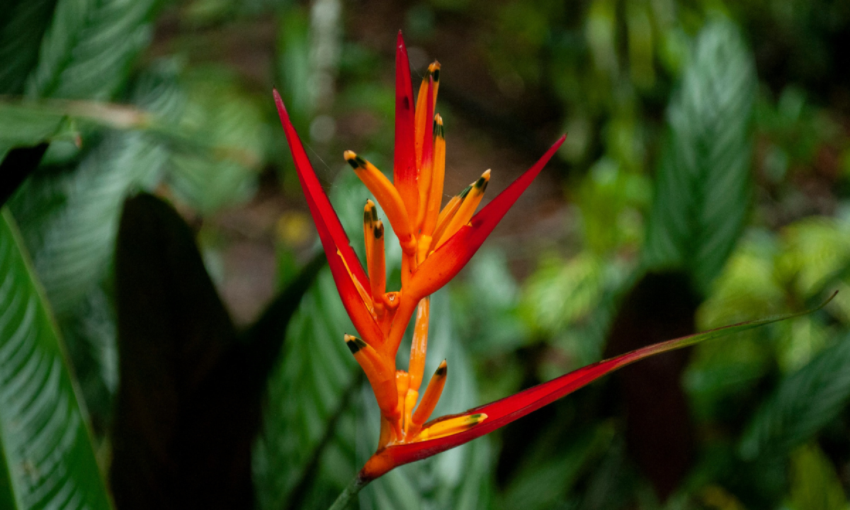 Helicônia: com flores em tons intensos de vermelho ou laranja, chama atenção de imediato.