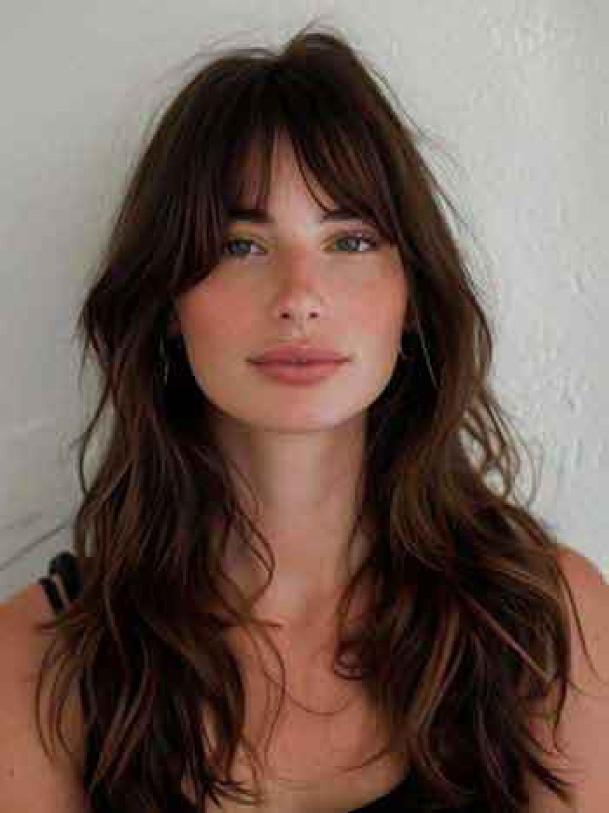 3. Cabelos Ondulados: Para esse tipo de fio, é recomendado o corte reto que termina em um comprimento uniforme (Blunt), mas com as pontas levemente desfiadas para dar um toque de movimento. “Ele mantém a estrutura e a definição das ondas, permitindo que elas se expressem, sem parecer pesadas. As pontas desfiadas adicionam suavidade e leveza ao visual”, comenta a hairstylist. Outro corte que valoriza o visual desse tipo de fio é o Shaggy cut, estilo descontraído e que apresenta diferentes comprimentos, criando um visual bagunçado e cheio de movimento. “O shaggy é perfeito para cabelos ondulados, pois realça a textura natural e proporciona um visual despreocupado. As diferentes camadas ajudam a dar volume e definição às ondas, tornando o cabelo mais leve e dinâmico”, completa.