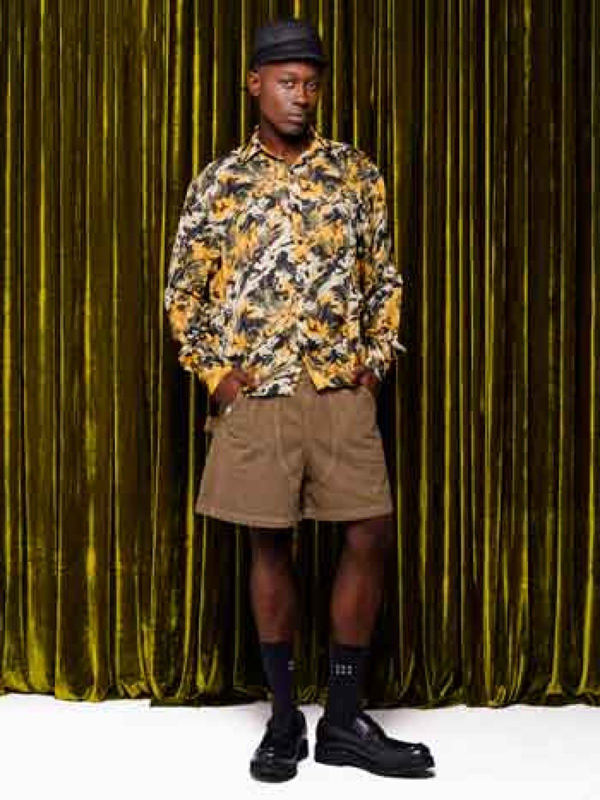 Pela primeira vez, a marca apresenta uma jaqueta autoral feita a partir da união de retalhos de matéria-prima nobre, o couro de avestruz e de pirarucu, num processo de patchwork artesanal. Outro destaque é a camuflagem reversa, criada por Giuliny Shauer . Diferente da função tradicional, essa camuflagem não busca esconder, mas sim revelar. Uma proposta visual que questiona e ressignifica.