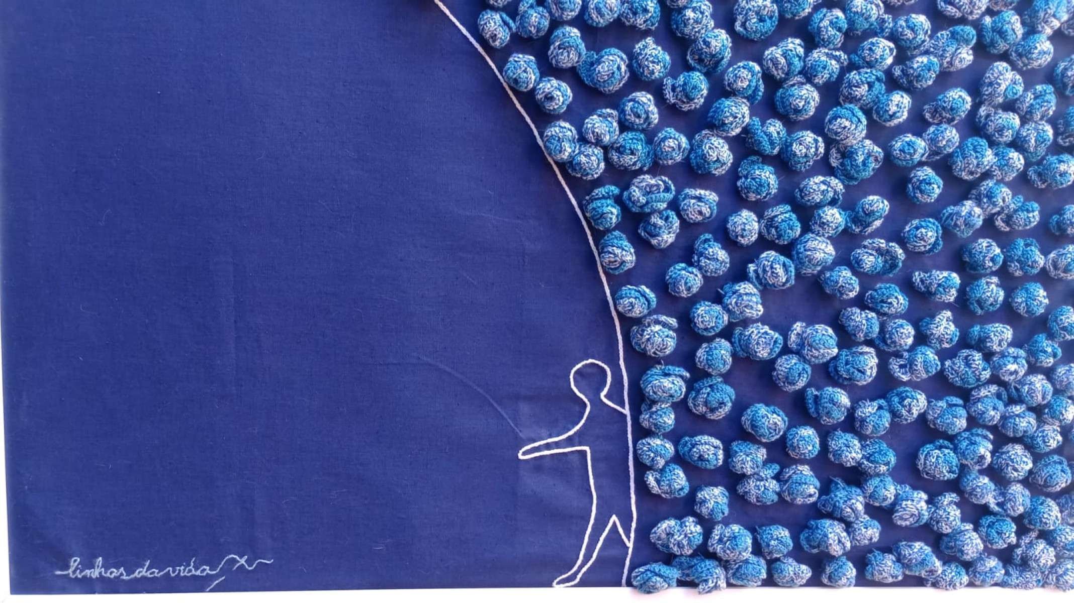 "O pano de fundo, em azul profundo, acolhe o caminho entre o visível e o invisível. De um lado, o arco dos fenômenos: flores de crochê azuis e brancas, alinhadas em repetição delicada, evocam o mundo das formas e dos ciclos. Do outro, o silêncio do eterno: o vazio, pleno e sereno, onde um homem, bordado em linha branca, atravessa purificado para o nada luminoso.Este quadro foi bordado por várias mulheres — mãos unidas por um mesmo gesto. Cada ponto, um respiro; cada fio, uma prece.O bordado tornou-se uma travessia compartilhada: o visível rendendo-se ao invisível".
