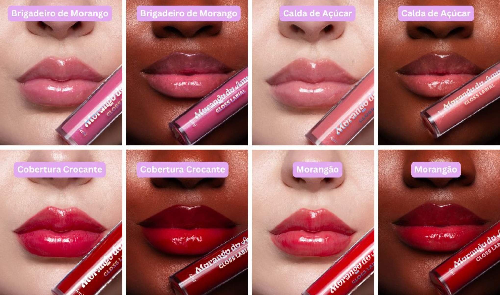 A coleção "Morango do Amor" apresenta 4 glosses labiais, com a promessa de cor translúcida, micropartículas de brilho e hidratação: