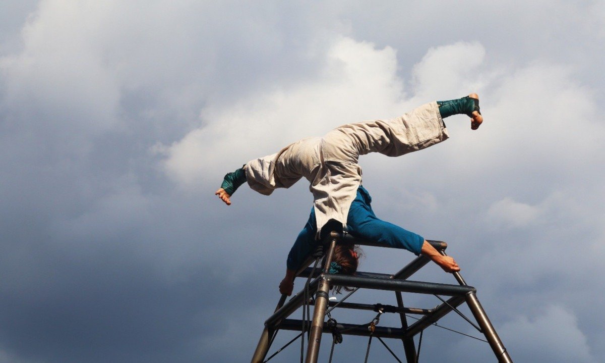 Iara usa movimentos acrobáticos para contar a história de uma pequena artista de circo que cria o espetáculo sozinha enquanto compartilha com o público sua vida, ideias, pesadelos, alegrias e desafios de ser artista. Foto: Namur En Mai/Divulgação
