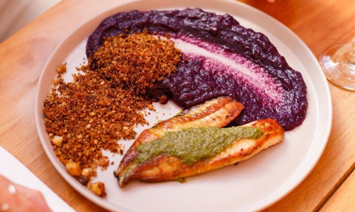 Tilápia com purê de batata doce e farofa de castanhas do Uluru (R$ 64) Foto: Uluru/Divulgação