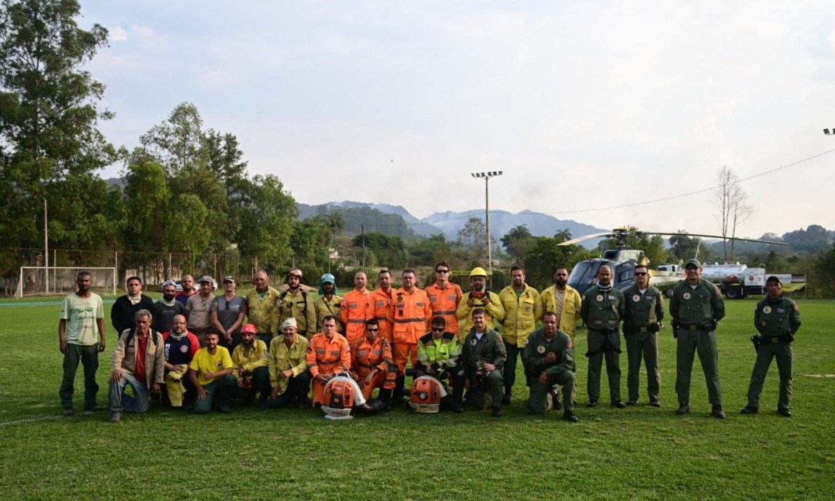 São 12 bombeiros, 15 voluntários do Instituto Estadual de Florestas (IEF), 10 voluntários da Defesa Civil de Tiradentes e São João del-Rei, além de brigadistas Foto: Leandro Couri/EM/D.A. Press