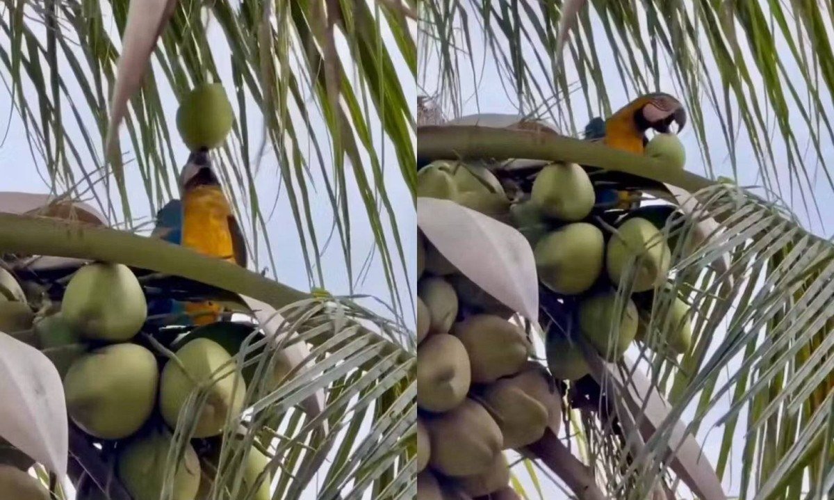 O pássaro impressiona ao segurar o coco com o bico, equilibrá-lo e beber todo o líquido de uma vez. Depois, sem a menor preocupação, descarta o fruto lá de cima, arrancando risadas do público. Foto: Reprodução/Instagram
