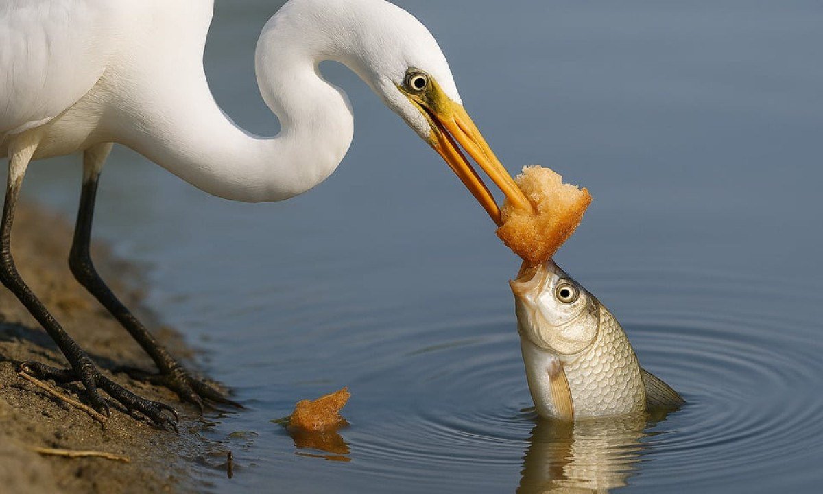 O registro foi feito por um estudante de 20 anos, que estava no parque com um amigo quando viu a ave jogando o pão na água e o recolhendo. Após várias tentativas, o pássaro capturou um peixe usando o pão como isca. O vídeo já soma mais de 56 mil curtidas no TikTok. Foto: Ilustração criada por inteligência artificial