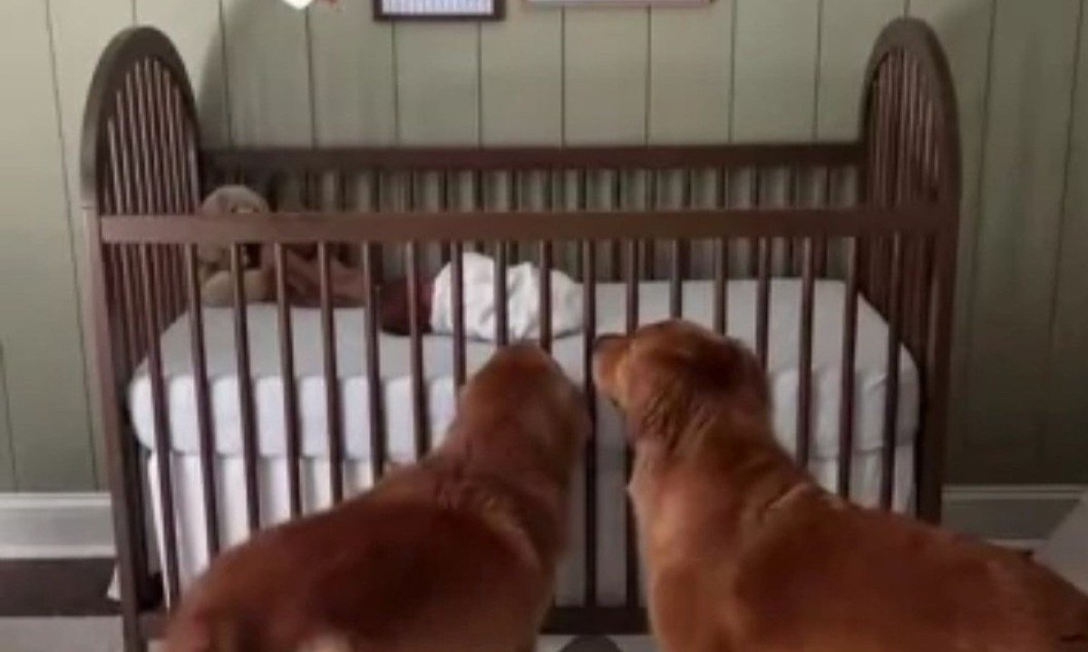 Com olhares atentos e movimentos delicados, Winnie e Scarlett cheiram o bebê suavemente e permanecem por perto, como se o acolhessem no novo lar. A cena encantou internautas, que destacaram a ternura e a sensibilidade dos animais diante da chegada do recém-nascido. Foto: reprodução TikTok
