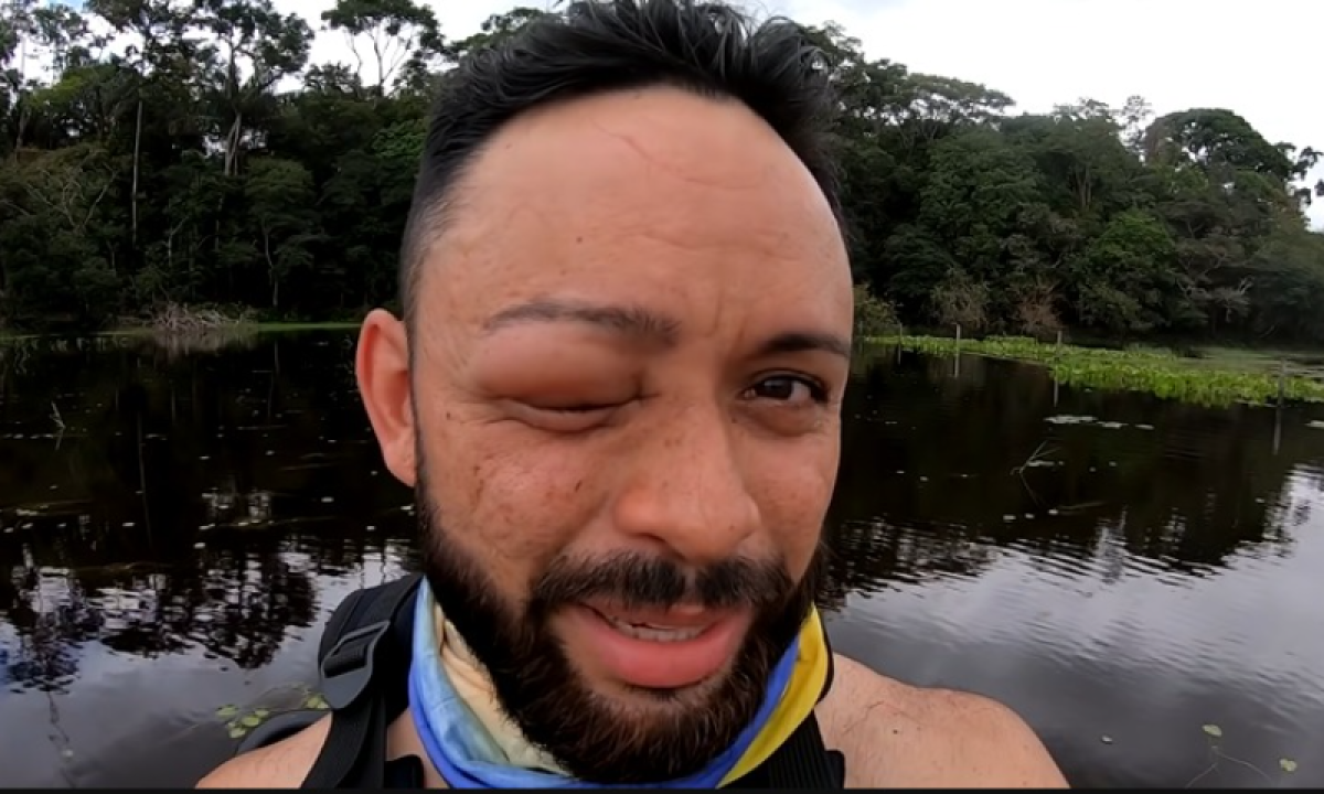“Quase perco meu olho numa aventura atrás de um pirarucu selvagem!!! Baita aventura numa pescaria em busca do gigante. Mas infelizmente fui abatido por várias ferroadas de cabas no olho, bem no meio da floresta” , contou na época. Foto: Reprodução/Youtube