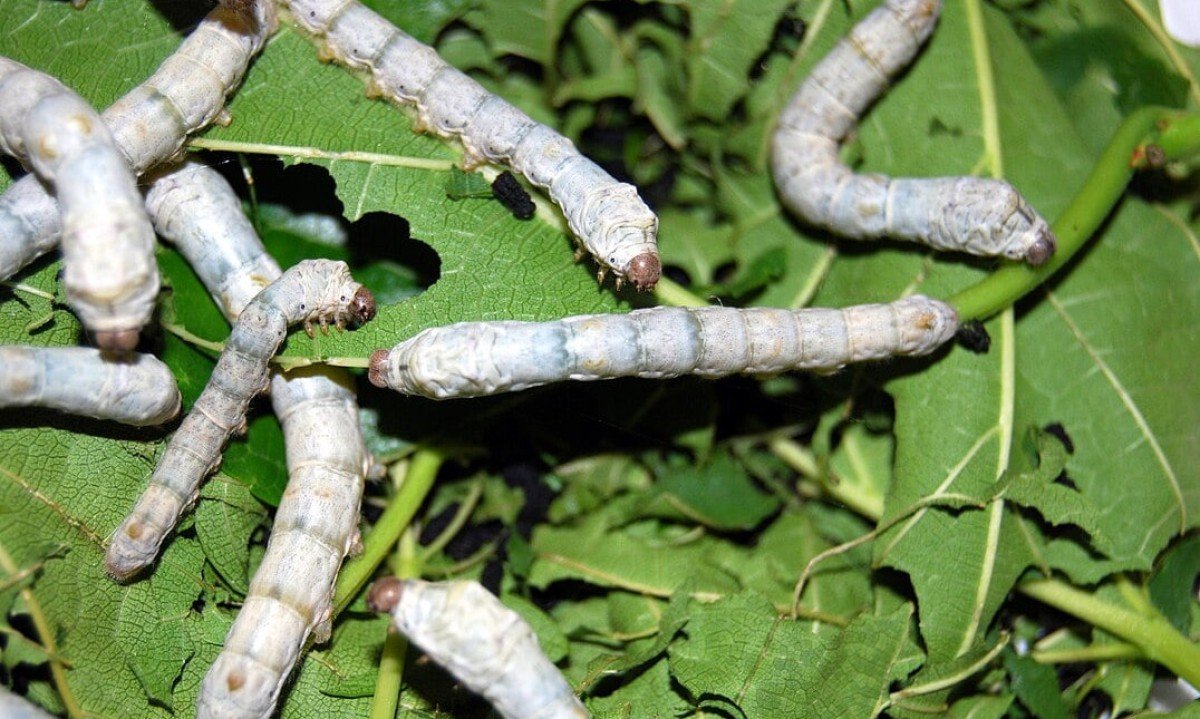 O bicho-da-seda é um inseto domesticado e criado para a produção de seda. Originário da China, habita locais controlados por humanos. Sua expectativa de vida é de cerca de 2 meses. Foto: Zivya - wikimedia commons