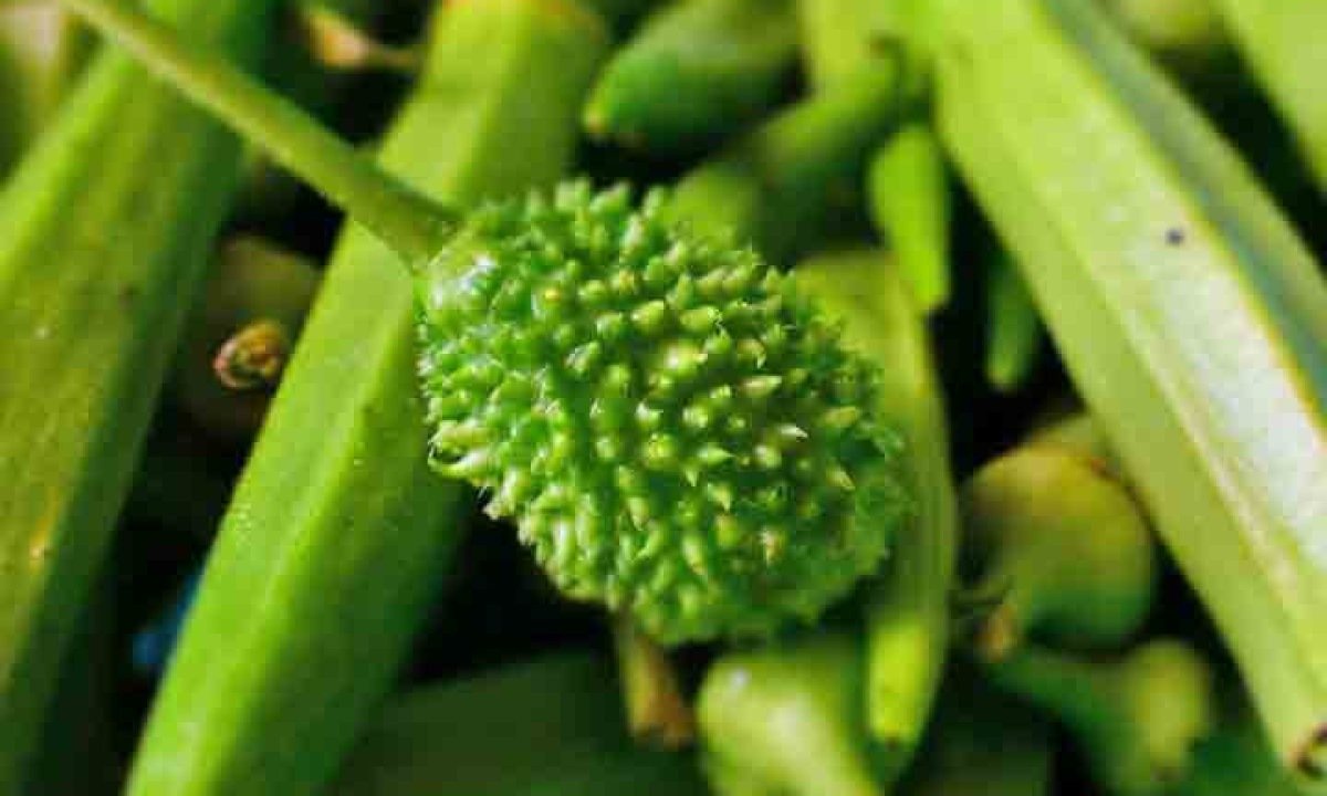 É um fruto ovalado, com casca verde e espinhos moles na superfície, que possui um sabor levemente amargo e textura crocante. Foto: Reprodução do Youtube -