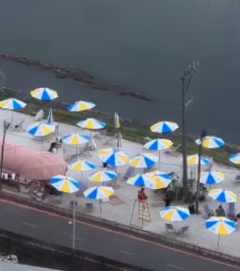 O espaço da "prainha" tinha cadeiras de praia, guarda-sóis e quadra de beach tennis em uma área com areia. Foto: reprodução/redes sociais