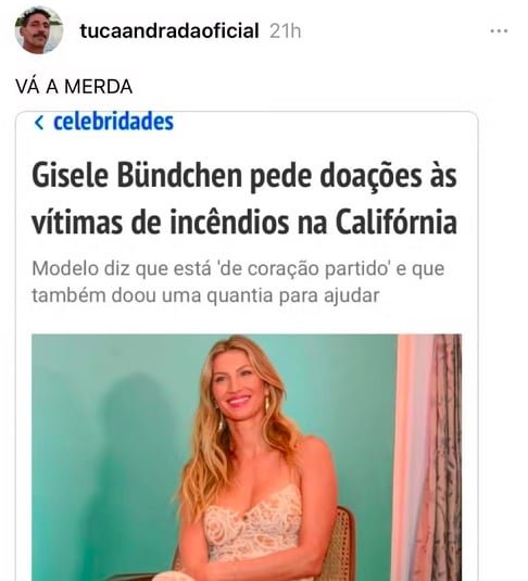 Gisele Bündchen pede doações a vítimas de incêndios nos EUA e é xingada por ator: ‘Vai à m.’